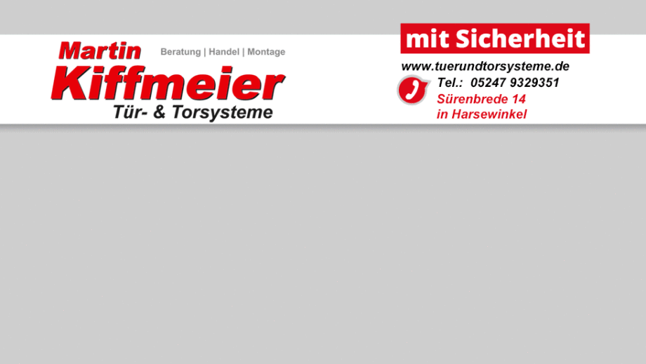 Mit über 15 jähriger Erfahrung und kompetentem Fachwissen im Bereich Tür-& Torsysteme stehen wir Ihnen gerne beratend zur Seite, wir unterstützen Sie bei der Auswahl der für Sie passenden Produkte und können Ihnen auf Wunsch auch Ersatzteile anbieten und montieren.