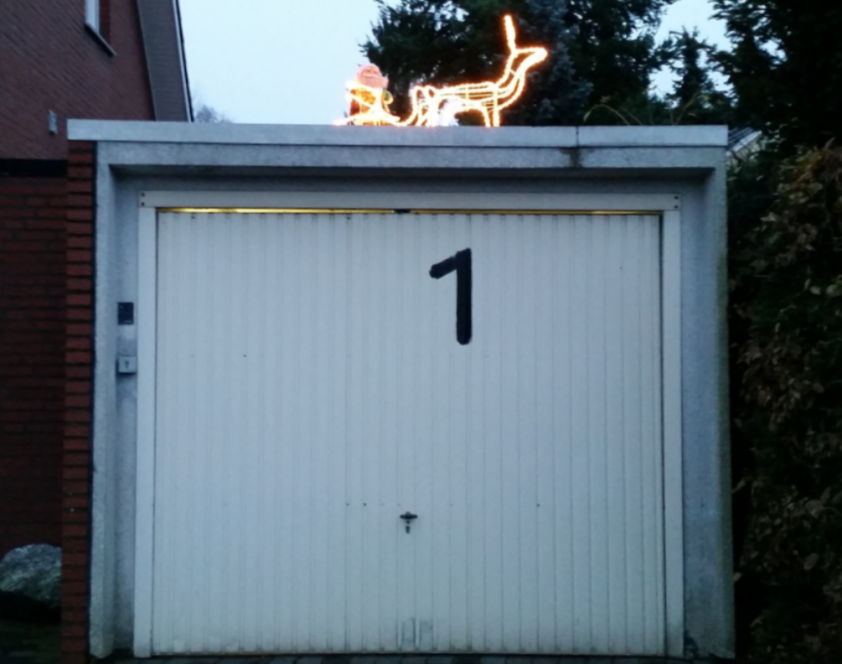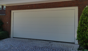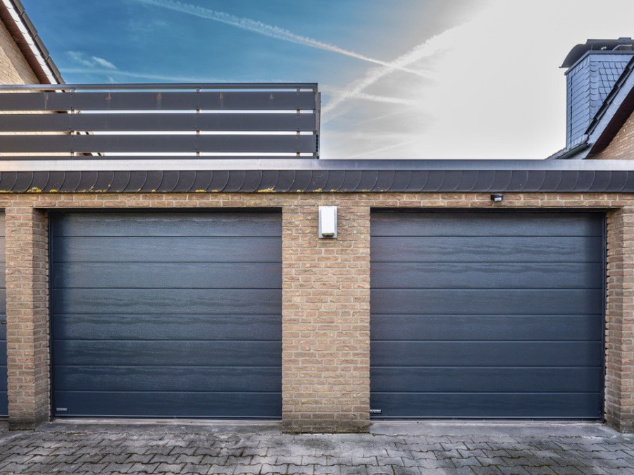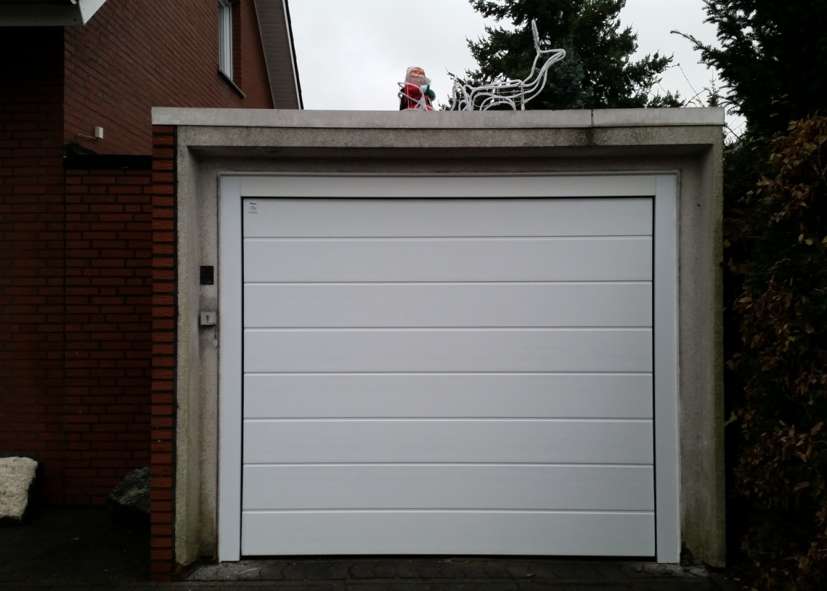 Auch bei Fertiggaragen haben wir immer eine Lösung parat, wie Sie auf dem Foto sehen können. Bei diesem Bauvorhaben haben wir ein Standard Sektionaltor in der Laibung montiert und mit auf Maß angefertigten Verkleidungs- blechen die seitlichen Zargen und die obere Blende verkleidet.